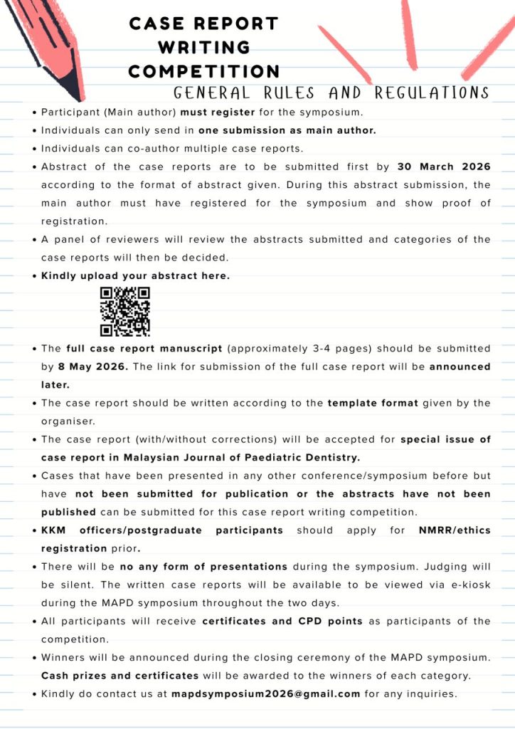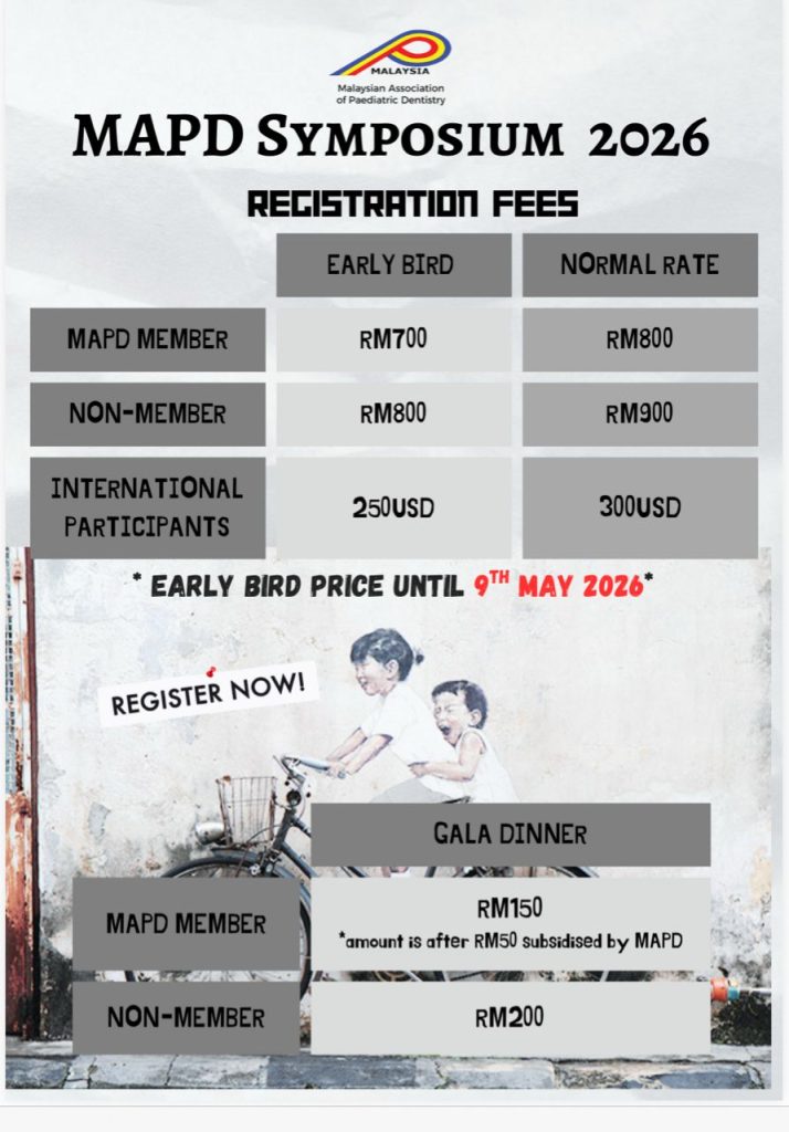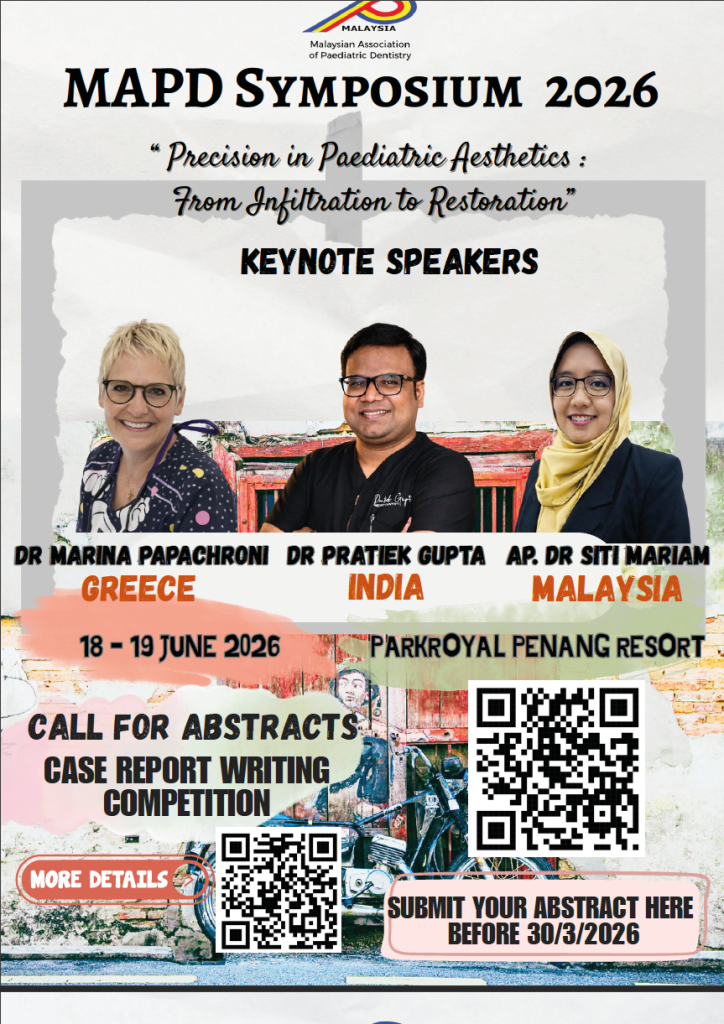 MAPD Symposium 2026By Amir Syafiq / January 14, 2026 MAPD Symposium 2026 by Malaysian Association of Paediatric Dentistry 217 217 people viewed this event. Join the Event. Click to Register. Member Registration Non Member Registration Register for event To register for this event please visit the following URL: → Date And Time 2026-06-18 to 2026-06-19 Location PARKROYAL Penang Resort Event Category Symposium Share With Friends Facebook Twitter Linkedin Xing Pinterest